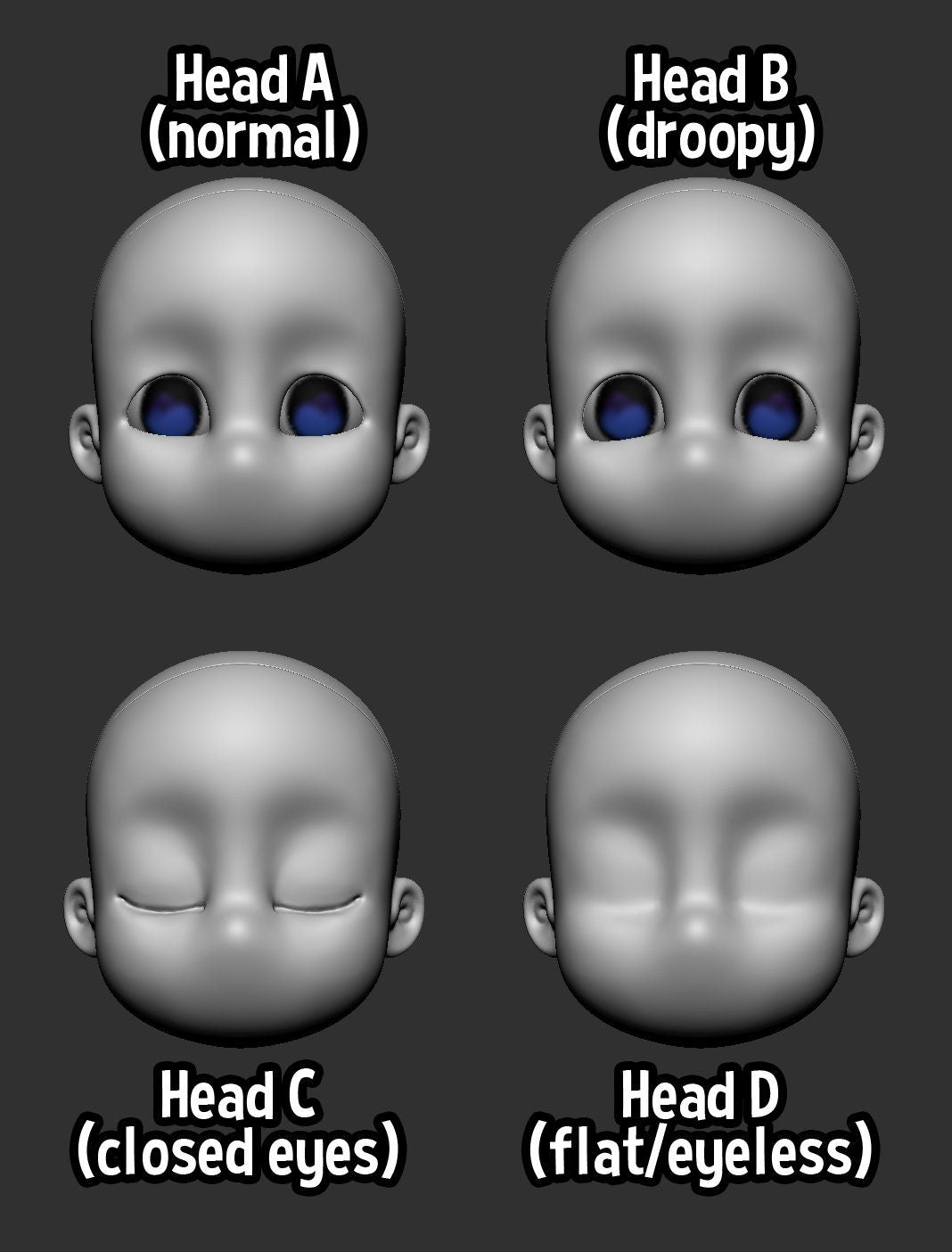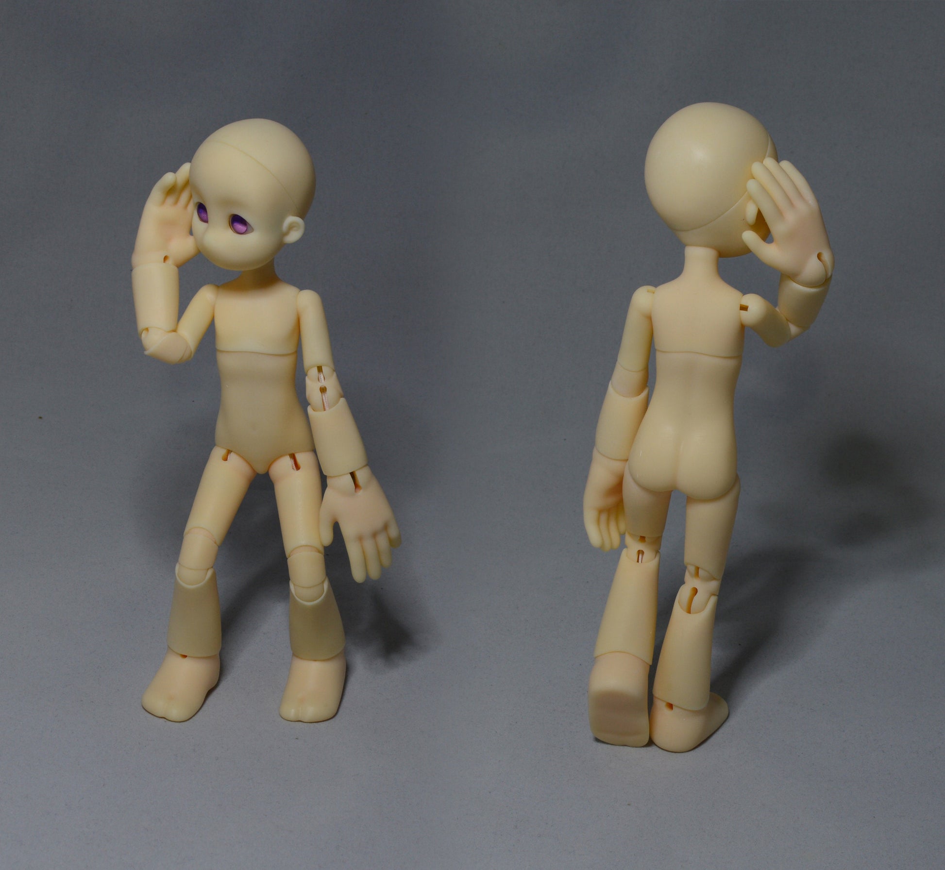 This is for a blank doll, 8 inches (20 cm) tall, 3D printed in ABS-like resin. Uses 12 mm eyes, with a pair of blank eyes included. There are 4 different faces, please specify which you would like when ordering a basic kit (I will send "A" by default). The 3 face kit omits head "D". This doll has locking joints in the knee; you have to pull the joint out to pose. This is a delicate toy not meant for children.